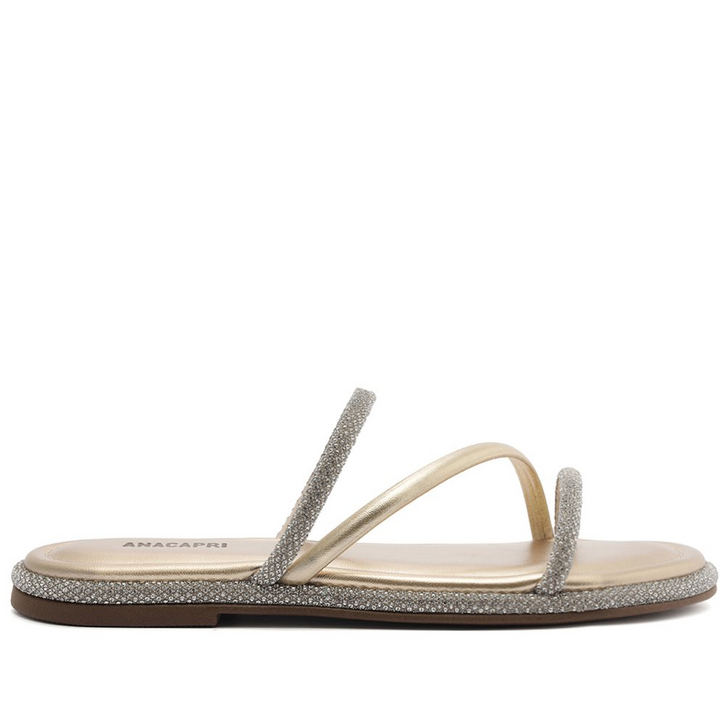 Rasteira de tiras finas, com detalhe glam, na cor dourada. O modelinho apresenta um trio de tiras bombadas, em material similar ao couro com detalhe glam em manta brilhosa: uma sobre os dedos, uma central transpassada dourada e outra sobre o peito de pé. De biqueira arredondada, traz palmilha acolchoada no mesmo tom da peça, solado emborrachado com leve saltinho traseiro e assinatura Anacapri - com detalhe glam em manta brilhosa no contorno do solado.