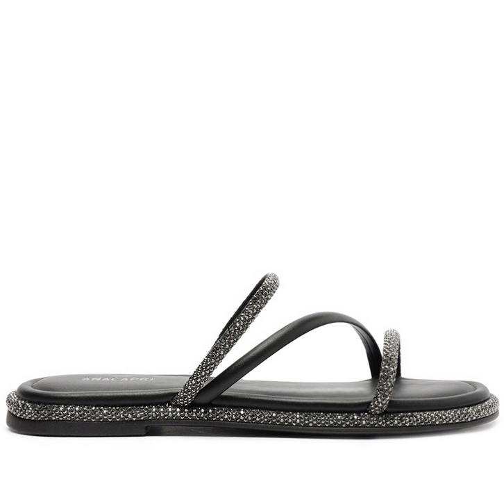 Rasteira de tiras finas, com detalhe glam, na cor preta. O modelinho apresenta um trio de tiras bombadas, em material similar ao couro com detalhe glam em manta brilhosa: uma sobre os dedos, uma central transpassada preta e outra sobre o peito de pé. De biqueira arredondada, traz palmilha acolchoada no mesmo tom da peça, solado emborrachado com leve saltinho traseiro e assinatura Anacapri - com detalhe glam em manta brilhosa no contorno do solado.