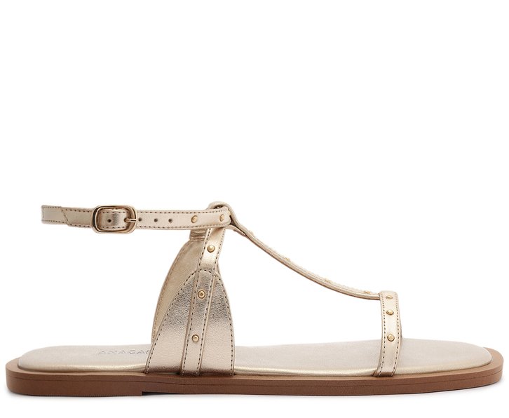 Rasteira de tiras finas, com detalhe em tachas, na cor dourada. O modelo possui solado rasteiro e emborrachado, com leve saltinho traseiro e biqueira quadrada. Apresenta cabedal em tirinha fina sobre os dedos - conectada por tira central que segue pela parte superior do peito de pé, presa pelas laterais em tiras mais largas, com fecho lateral afivelado, na tira que contorna o tornozelo. Detalhe para aplicação de tachas metálicas nas tiras. Traz palmilha acolchoada no mesmo tom da rasteirinha, com assinatura Anacapri.