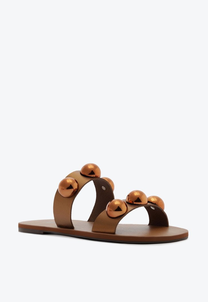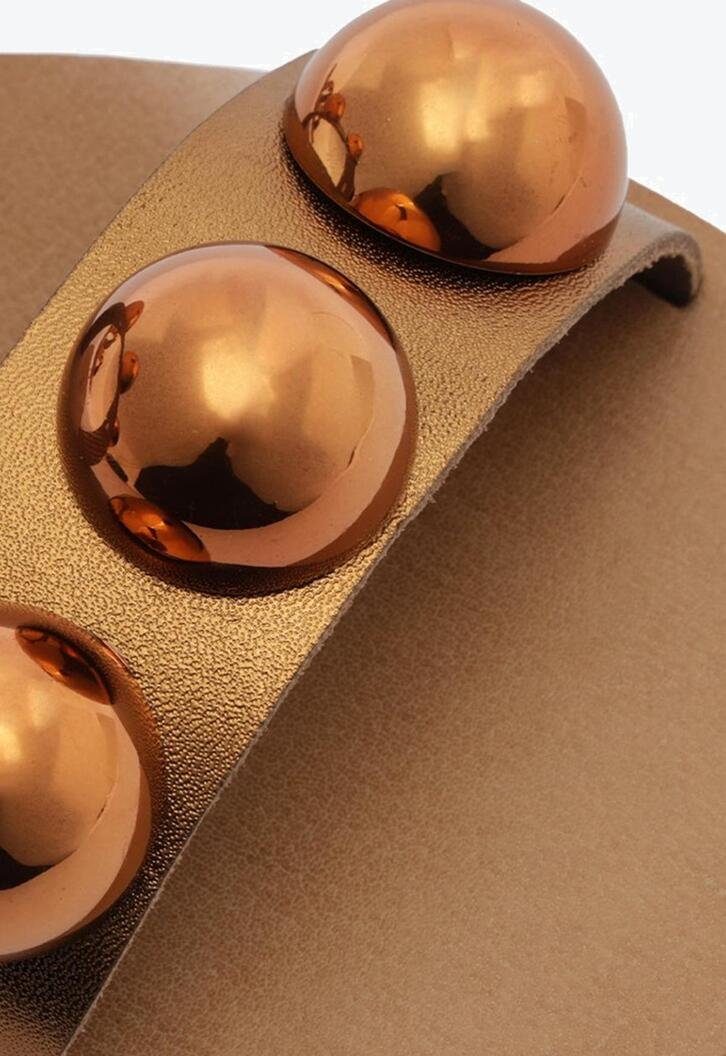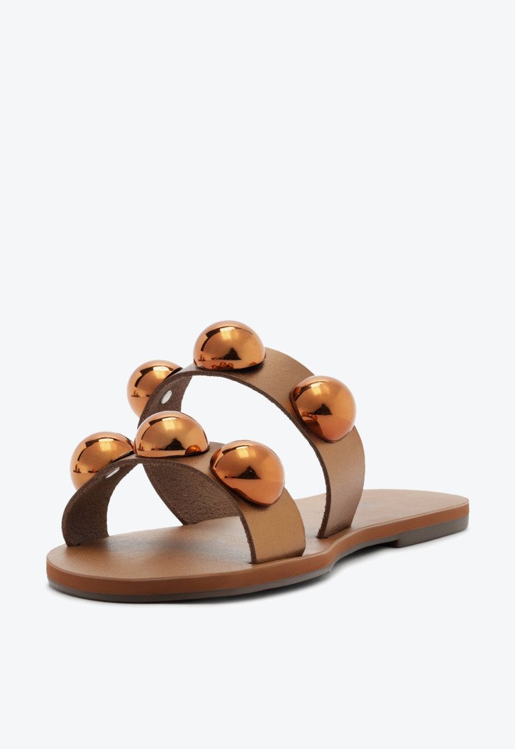 Rasteira Pop de tiras paralelas em couro, com detalhe em esferas, na cor bronze. O modelo possui solado rasteiro e emborrachado, com leve saltinho traseiro. De biqueira arredondada em couro, apresenta cabedal com duas tiras largas e paralelas - uma sobre os dedos e a outra sobre o peito de pé - com aplicação de trio de maxi esferas do mesmo tom da rasteirinha, sobre as tiras. Com assinatura Anacapri na palmilha marrom. Aberta, a rasteirinha exibe todo o pé.