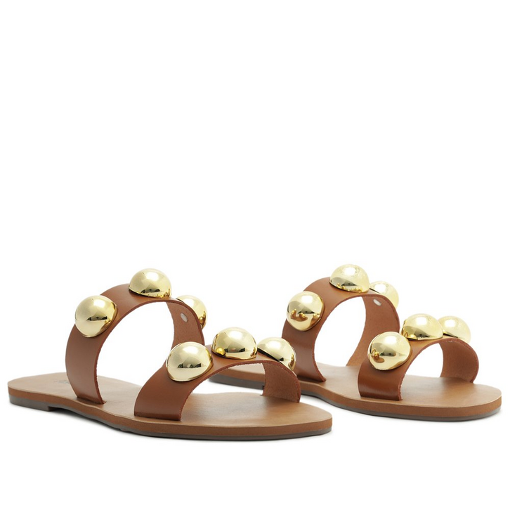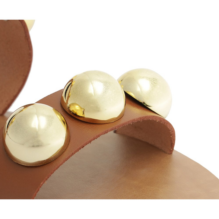 Rasteira Pop de tiras paralelas em couro, com detalhe em esferas, na cor marrom. O modelo possui solado rasteiro e emborrachado, com leve saltinho traseiro. De biqueira arredondada em couro, apresenta cabedal com duas tiras largas e paralelas - uma sobre os dedos e a outra sobre o peito de pé - com aplicação de trio de maxi esferas do mesmo tom da rasteirinha, sobre as tiras. Com assinatura Anacapri na palmilha marrom. Aberta, a rasteirinha exibe todo o pé.