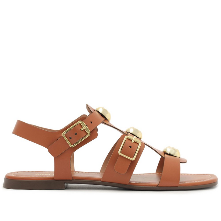 Rasteira de três tiras, com aplicação de adornos, na cor marrom. O modelo possui solado emborrachado, com leve saltinho traseiro e biqueira arredondada. Traz cabedal em trio de tiras com design de recorte - uma sobre os dedos, outra sobre o peito de pé e uma central - que se conectam entre si, com detalhe para aplicação de adornos metálicos imponentes. Possui tira traseira que contorna o calcanhar, conectada em tira afivelada, com fecho no tornozelo. Possui palmilha acolchoada comfy, no mesmo tom da rasteirinha e assinatura Anacapri.