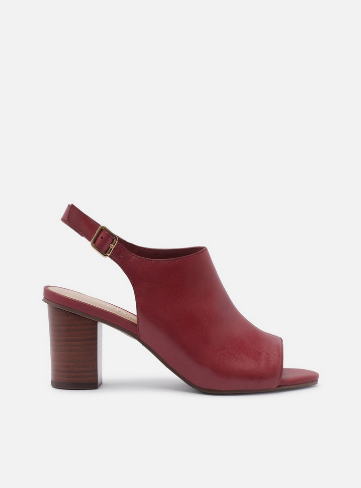 Sandália feminina de couro bordô. O sapato tem salto médio bloco e formato arredondado na ponta. Traz cabedal fechado cobrindo toda a parte superior do pé, exceto dedos. Possui tira fina no calcanhar, conectada ao cabedal, com fivela metálica lateral. Com palmilha bege e inscrição do nome da marca. Deixa dedos e calcanhar à mostra.