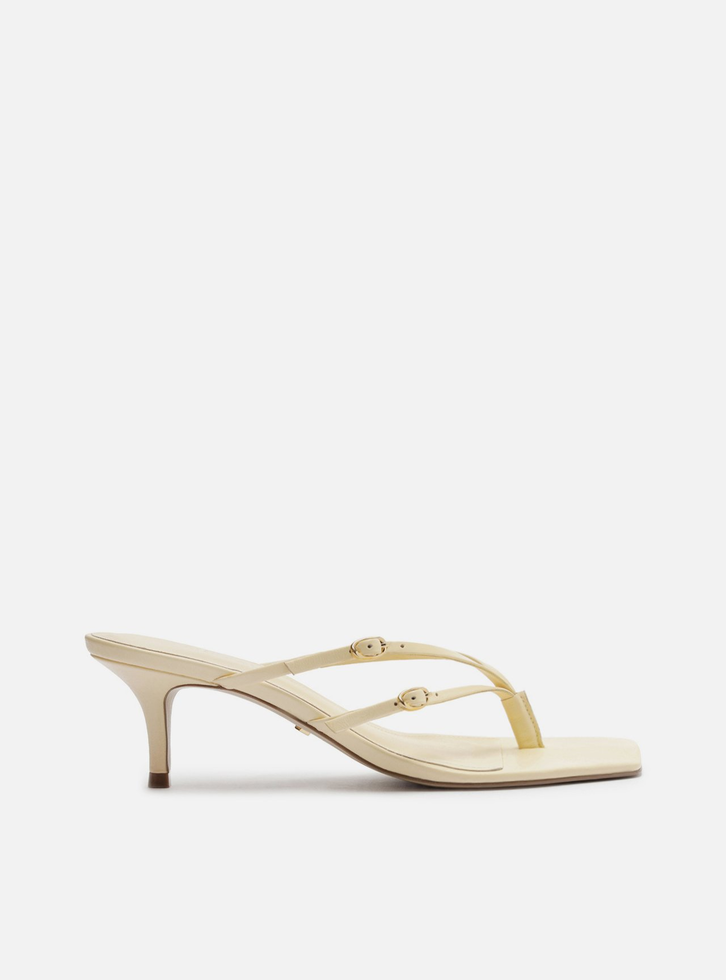 Sandália amarela de couro. O sapato tem salto médio fino e formato quadrado na ponta. Traz tiras finas dividindo os dedos e com fivelas nas laterais. Com palmilha da cor do calçado e inscrição do nome da marca.