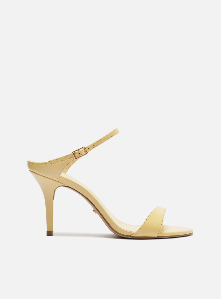 Sandália amarela de couro. O sapato tem salto médio fino e formato arredondado na ponta. Traz tira sobre os dedos, mais larga em uma das laterais, e tira fina na parte superior do pé que fecha em fivela lateral. Com palmilha da cor da sandália e inscrição do nome da marca. A sandália exibe todo o pé.