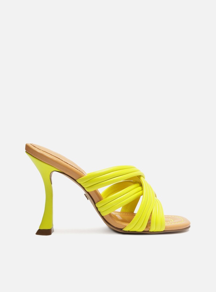 Sandália amarela. O modelo tem salto alto fino taça amarelo e bico quadrado. Traz tiras bombadas e triplas, cruzadas sobre os dedos e o peito do pé. Com palmilha marrom, estofada, com costuras pesponto e inscrição do nome da marca. A sandália exibe parte do pé.