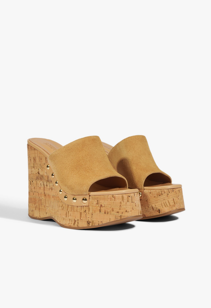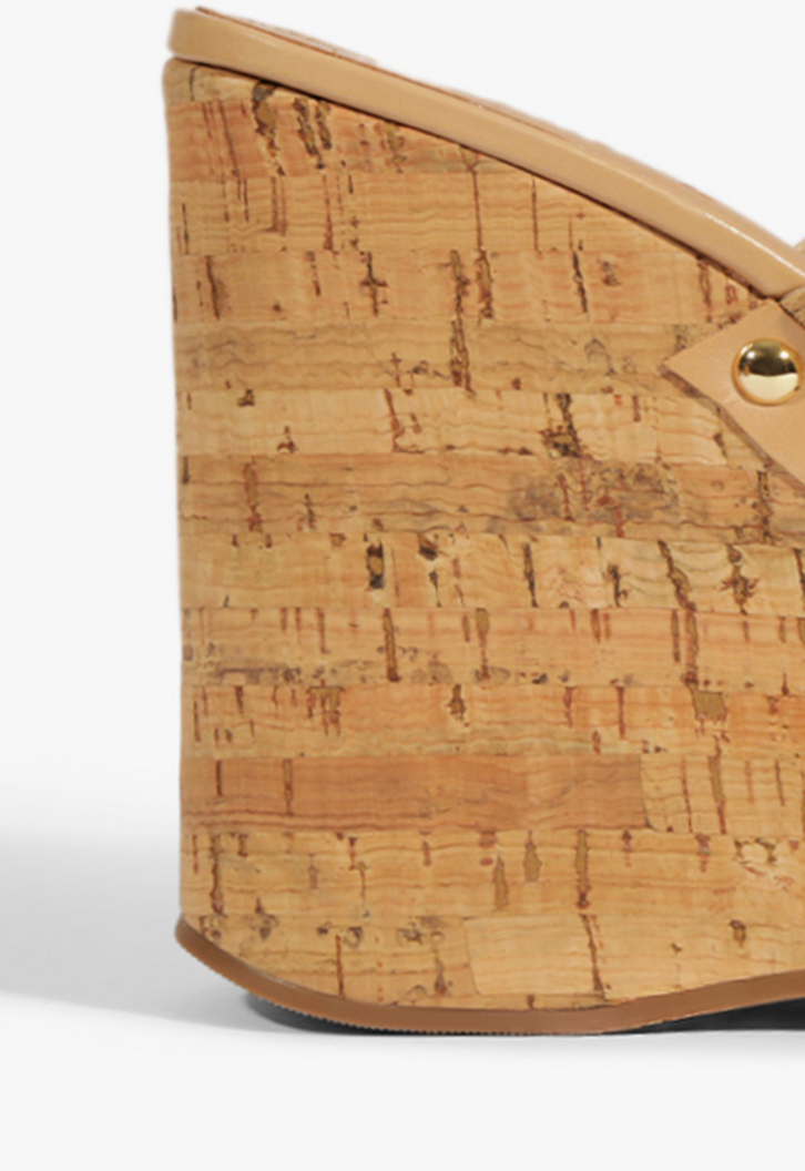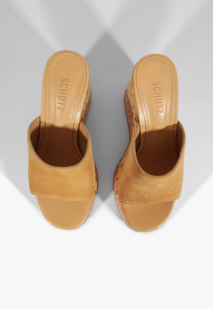 Sandália Anabela Camurça Cortiça Tachas Marrom Clara