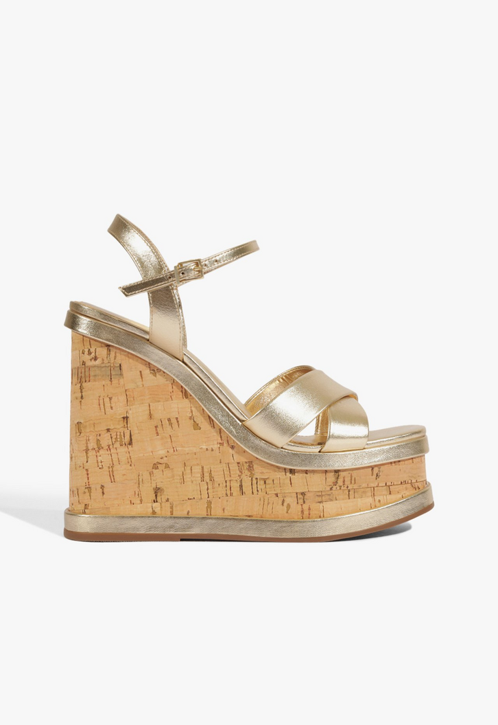 Simplesmente apaixonante! Essa sandália dourada anabela se destaca por seu salto imponente que combina cortiça e couro de uma forma super cool! O detalhe da gáspea em X e fechamento de fivela completam o visual com delicadeza. Uma aposta certeira para deixar suas produções mais interessantes!