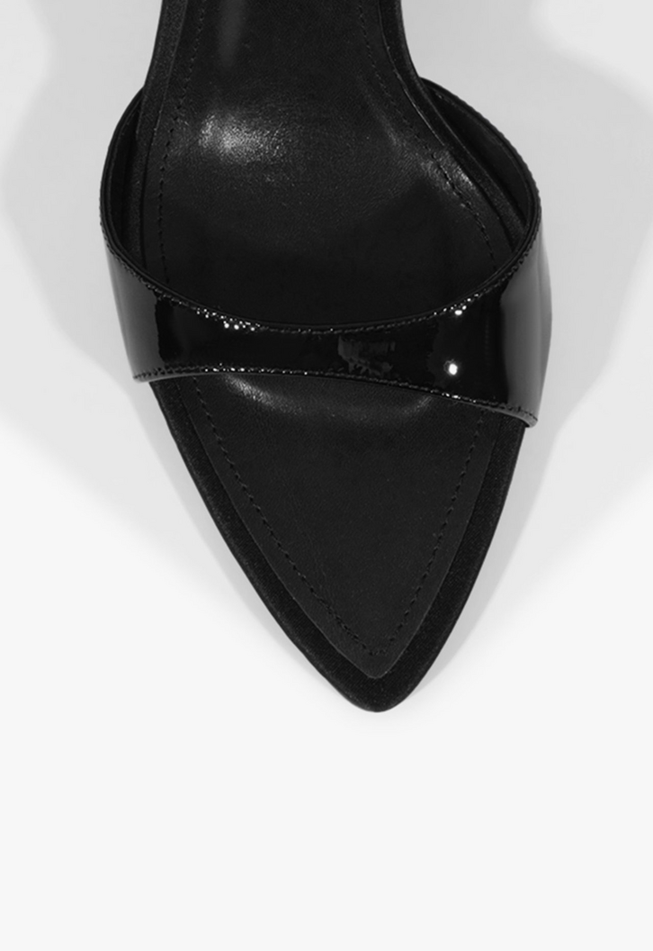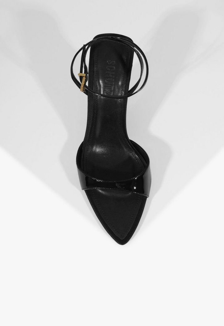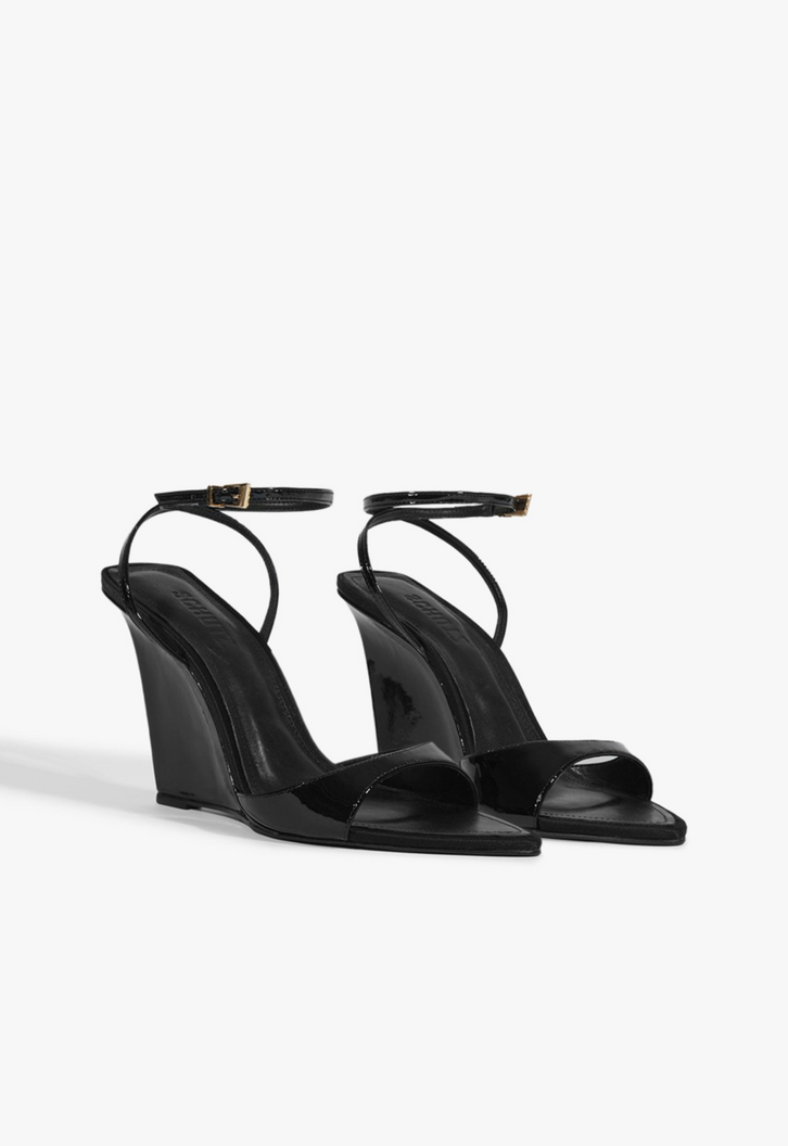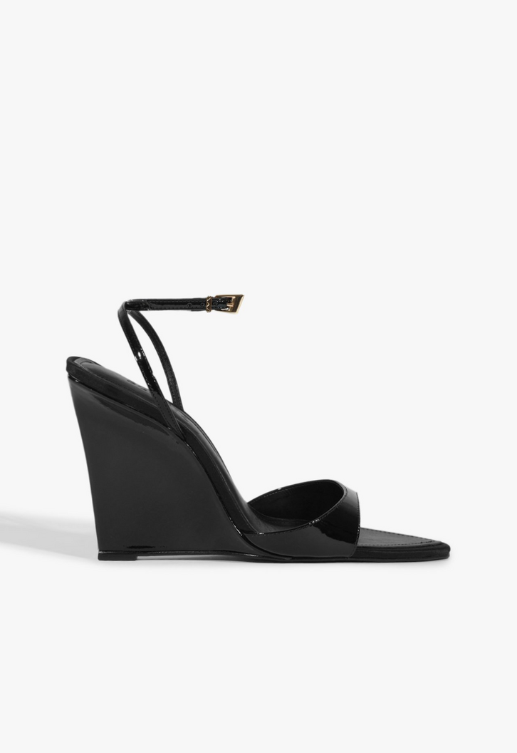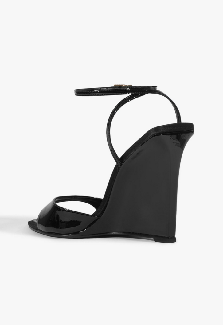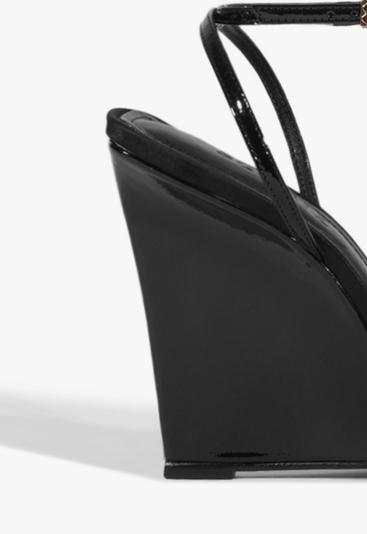 Esta sandália anabela em couro envernizado se destaca por seu visual minimalista e sofisticado. O cabedal traz uma tira única sobre os dedos e delicadas tiras em X com fechamento por fivela no tornozelo, garantindo leveza e ajuste ideal. O salto anabela tem um design refinado, e o bico folha adiciona feminilidade ao design. É aquela sandália preta ideal para compor looks poderosos e elegantes. Aposte!