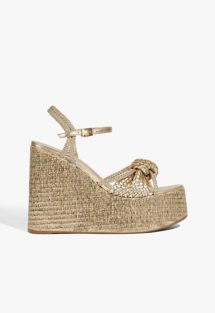 Impactante com sua meia pata, essa sandália anabela é daquelas que fazem o look! A tira larga sobre os dedos em tramado dourado se destaca com um charmoso detalhe de nó central. Com fechamento por fivela na delicada tira no tornozelo, ela traz o conforto e glamour do salto anabela. Ideal para looks de verão sofisticados, ela vai do passeio descontraído ao evento especial com muito estilo!