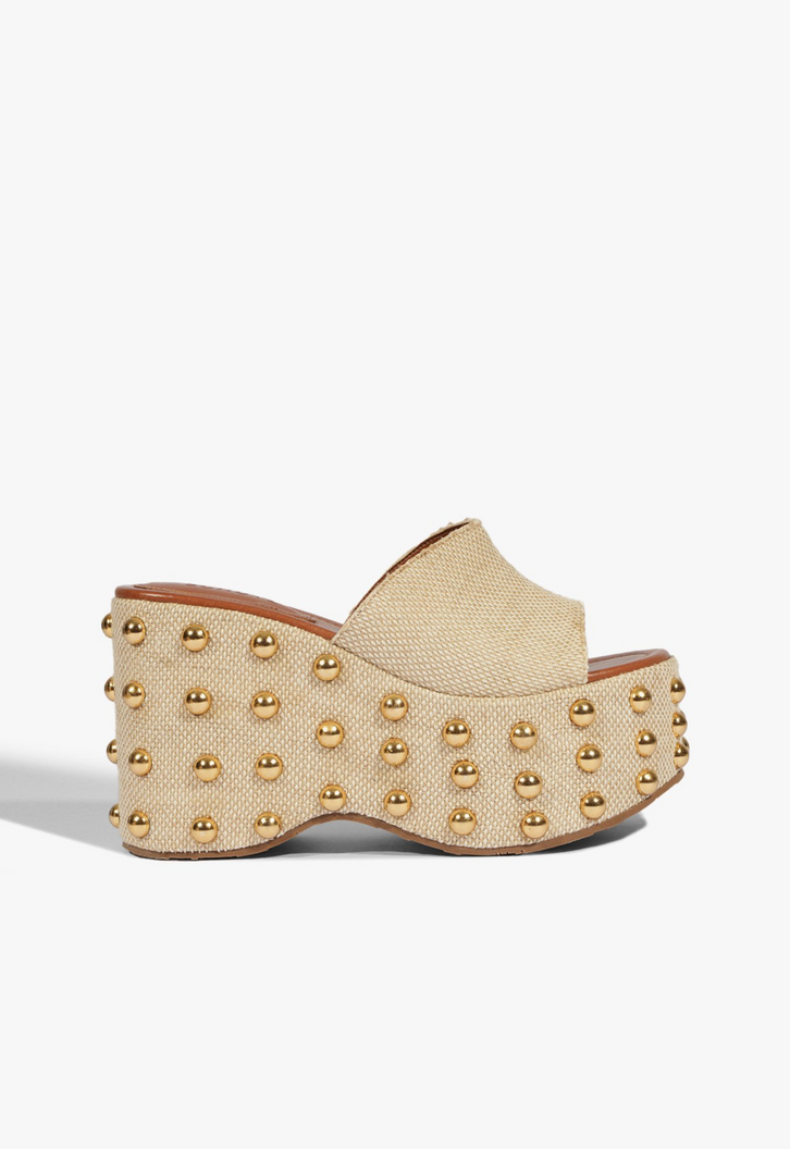 Esta sandália tipo tamanco anabela com acabamento em ráfia natural é perfeita para looks sofisticados com um ar fresh. Além da elegância da tira única grossa, o design marcante da plataforma elevada ganha ainda mais personalidade com a aplicação das glamurosas tachas douradas. Aposte!