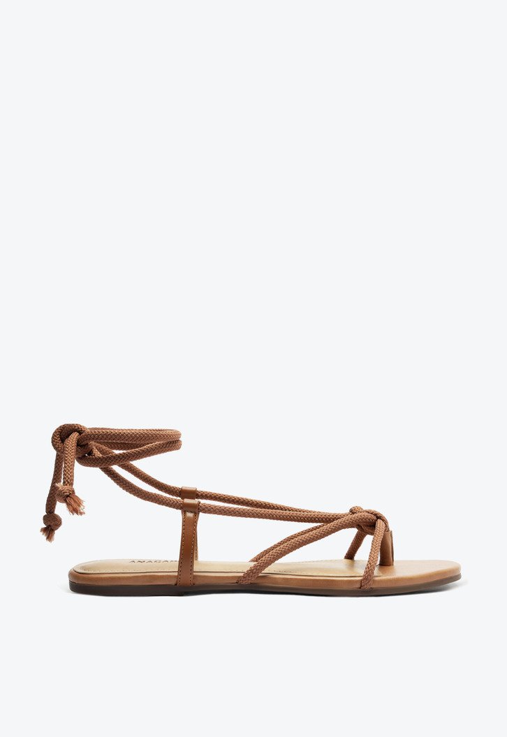 Sandália rasteira com tiras em cordão e amarração na cor marrom. O modelo de material similar ao couro traz biqueira quadrada. Possui cabedal com tiras finas em cordão sobre os dedos, unidas por nó no centro. Duas delas sobem o peito do pé e contornam o tornozelo, com fecho em amarração. Apresenta ainda tiras lisas de suporte nas laterais. A sandália possui palmilha bege com assinatura Anacapri.