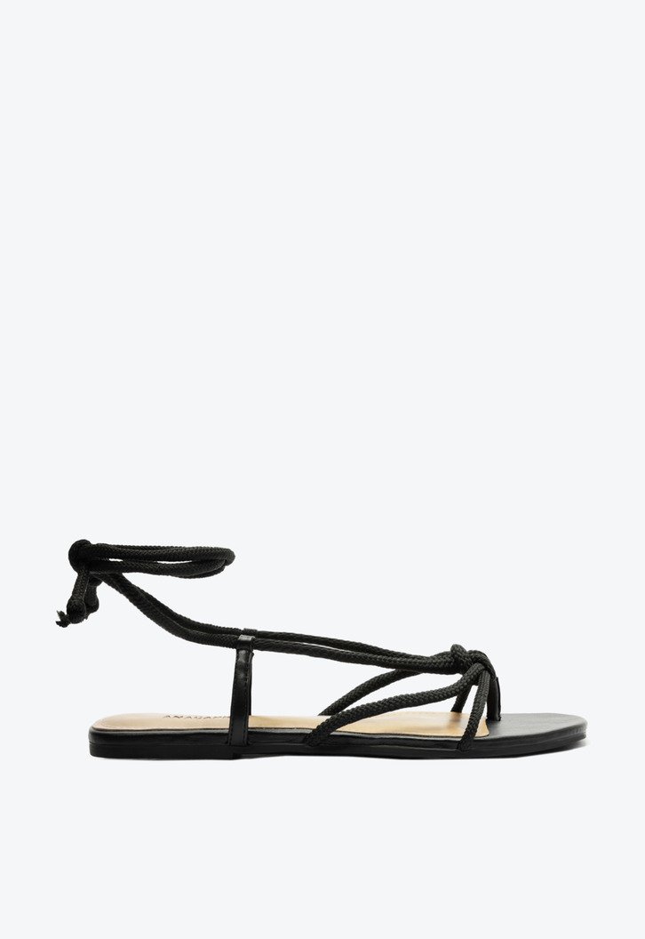 Sandália rasteira com tiras em cordão e amarração na cor preta. O modelo de material similar ao couro traz biqueira quadrada. Possui cabedal com tiras finas em cordão sobre os dedos, unidas por nó no centro. Duas delas sobem o peito do pé e contornam o tornozelo, com fecho em amarração. Apresenta ainda tiras lisas de suporte nas laterais. A sandália possui palmilha bege com assinatura Anacapri.