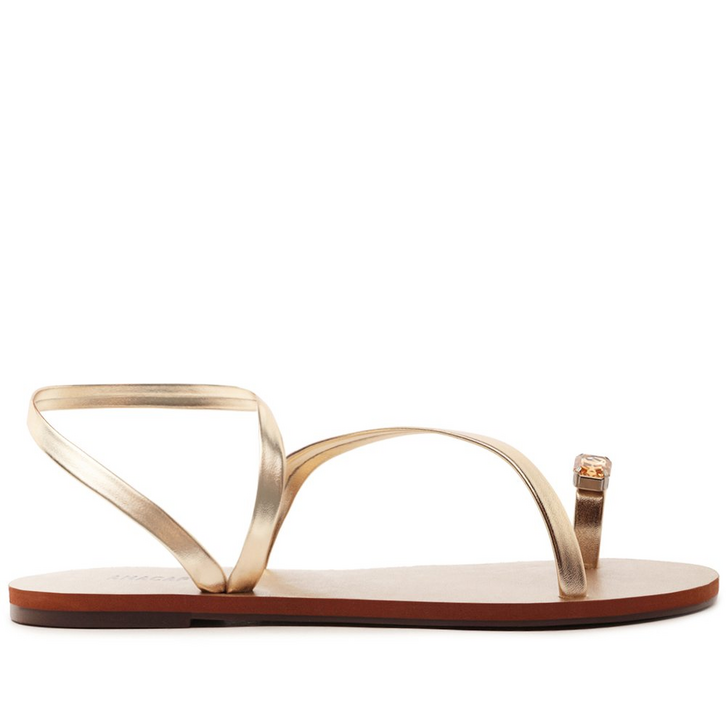 Rasteira de tiras assimétricas com encaixe e detalhe em pedraria, na cor dourada. De material similar ao couro com efeito metalizado e biqueira arredondada, possui solado emborrachado, com leve saltinho traseiro. O modelo traz cabedal com trio de tirinhas: uma sobre o dedão - com detalhe de aplicação de pedraria imponente, outra que perpassa em curva no peito de pé presa na lateral e uma tira traseira elástica em meia cana transversal - que passa pelo tornozelo, contornando o calcanhar pela lateral, facilitando o calce de encaixe. Traz palmilha no mesmo tom da rasteirinha, com assinatura Anacapri em carimbo metálico.