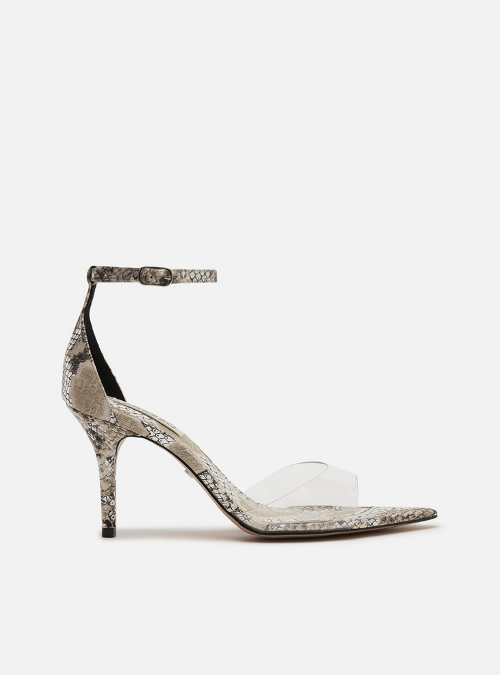 Sandália feminina com estampa e textura snake. O modelo tem salto médio e bico fino. Traz tira média transparente sobre os dedos. Fechada no calcanhar, possui tira fina em torno do tornozelo com fivela metálica lateral. A sandália exibe todo o peito do pé e os dedos.