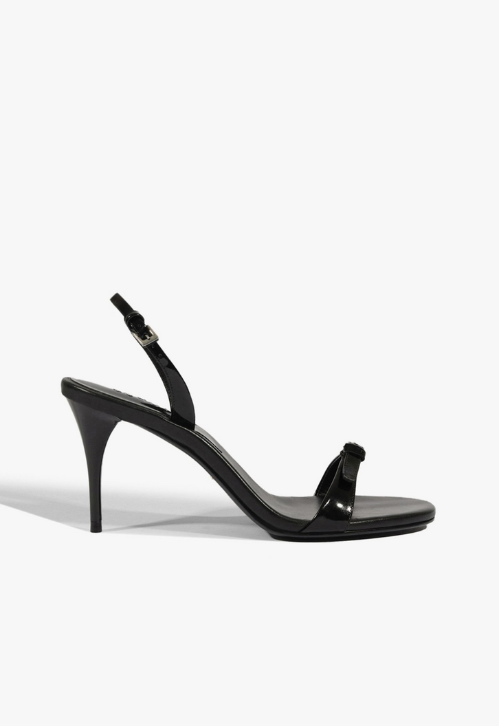 Sandália feita em couro envernizado, cabedal com uma tira fina na região dos dedos, com detalhe de fivela. Salto médio e fechamento com fivela no tornozelo.