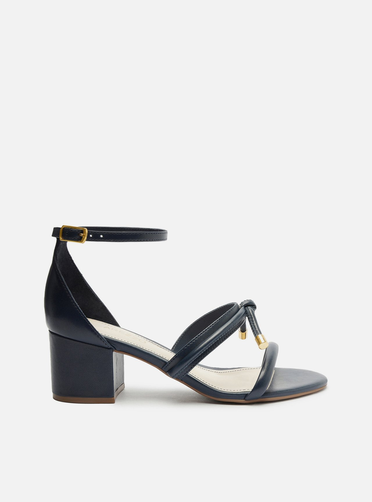 Sandália azul de couro. O modelo tem salto médio bloco e bico redondo. Traz tiras bombadas sobre os dedos e o peito do pé, essa segunda com aplicação de tira sobreposta com nó. Fechada no calcanhar, possui tira fina em torno do tornozelo com fivela metálica lateral. A sandália exibe todo o peito do pé e os dedos.