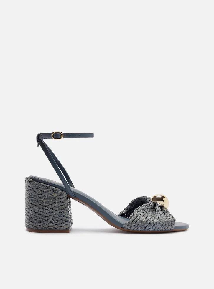 Sandália feminina azul em material tramado. O sapato tem salto médio bloco revestido no mesmo material e formato arredondado na ponta. Possui tira larga sobre os dedos, com leve franzido central e aplicação de esfera metálica dourada. Traz tiras finas que saem das laterais, cruzam no calcanhar, contornam o tornozelo e fecham em fivela lateral. Com palmilha lisa e inscrição do nome da marca.