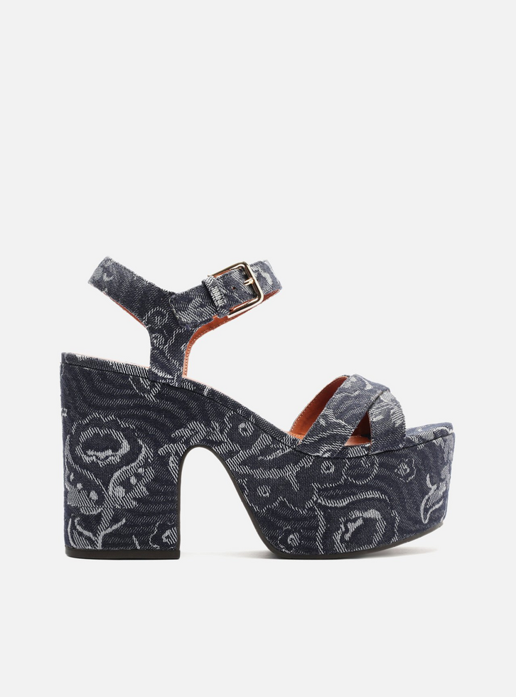 Sandália feminina azul em tecido jacquard estampado. O sapato tem salto alto bloco, meia pata e formato arredondado na ponta. Traz sola em tecido e tiras cruzadas sobre os dedos. Possui tira no calcanhar e tira frontal que fecha em fivela lateral. Com palmilha lisa em couro marrom e inscrição do nome da marca.