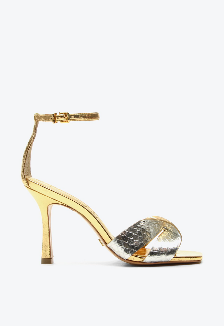 Sandália feminina Bariloche em couro multicolor. Com tiras que se entrelaçam em estilo laço, mesclando detalhes dourados e prateados, esse modelo une delicadeza e sofisticação em um salto alto elegante. Perfeita para transformar qualquer produção em destaque. Ideal para quem busca conforto aliado a um design moderno, essa sandália se torna a escolha certa para looks que pedem estilo e presença.