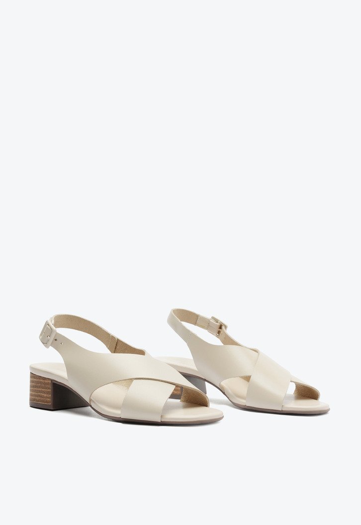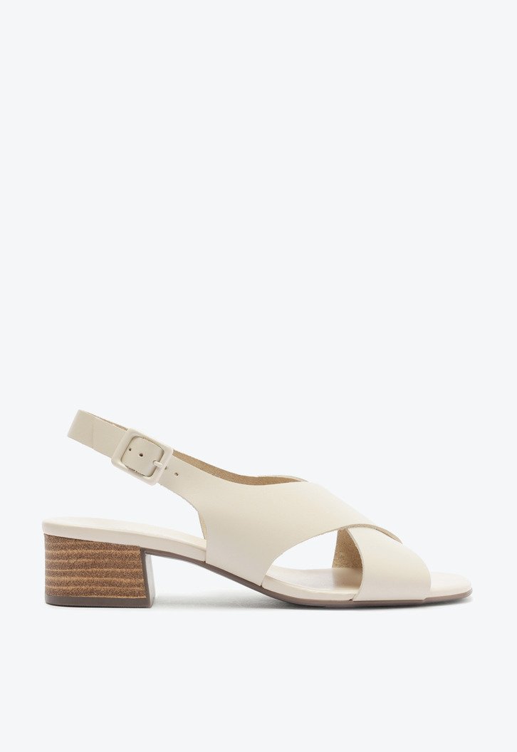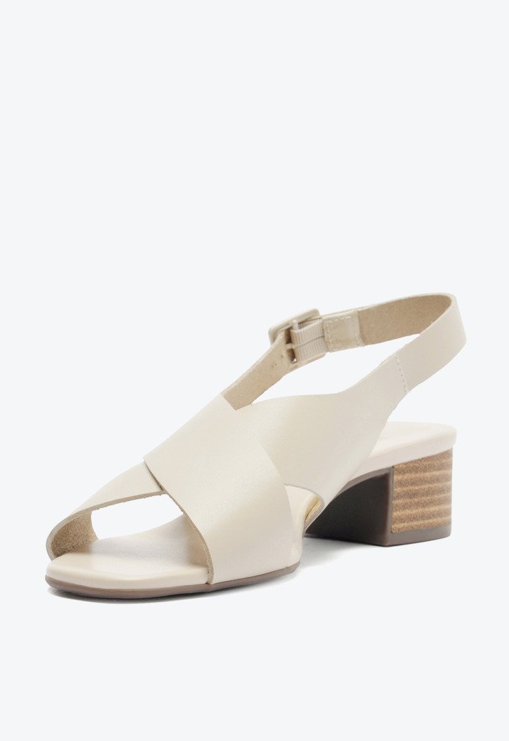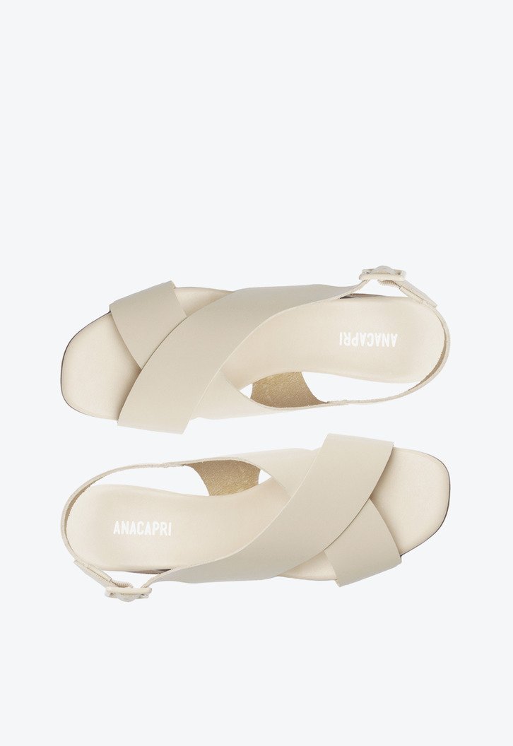Sandália de salto bloco e tiras cruzadas, na cor bege. O modelo de material similar ao couro, possui salto em bloco médio. Apresenta cabedal em duas tiras mais largas - que se cruzam em design de “X” - sobre os dedos e peito de pé, que seguem pelas laterais da pala e contornam o calcanhar, com fecho afivelado ajustável na lateral. De biqueira quadrada, traz palmilha acolchoada de mesmo tom da peça, com assinatura Anacapri.