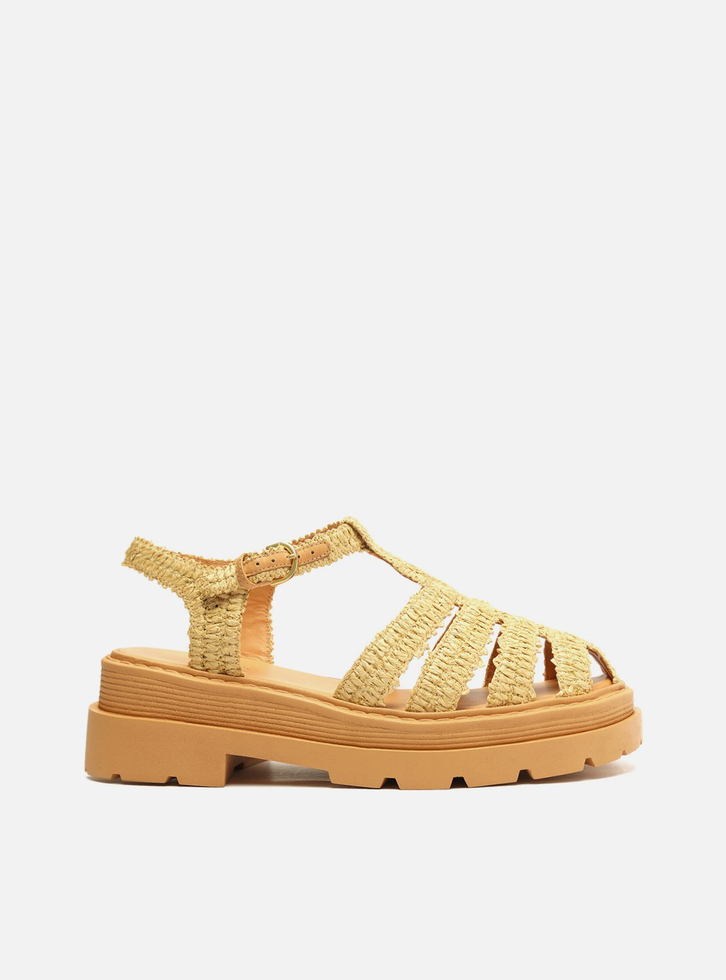 Sandália bege em tecido bordado. O modelo tem salto baixo bloco, base emborrachada tratorada e bico redondo. Traz tiras grossas no cabedal, cobrindo parte dos dedos e do peito do pé, sendo uma maior central e as demais horizontais, entrelaçadas. Possui ainda tiras em torno do calcanhar e do tornozelo, fechando em fivela lateral. Aberta, tem palmilha com nome da marca e exibe parte do pé.