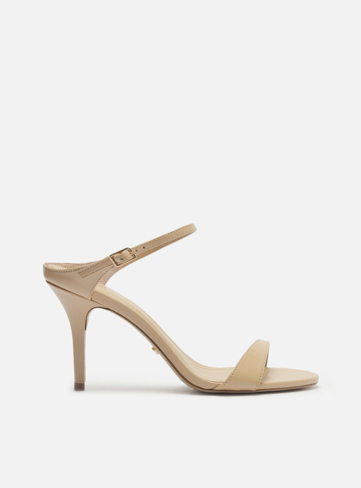 Sandália bege de couro. O sapato tem salto médio fino e formato arredondado na ponta. Traz tira sobre os dedos, mais larga em uma das laterais, e tira fina na parte superior do pé que fecha em fivela lateral. Com palmilha da cor da sandália e inscrição do nome da marca. A sandália exibe todo o pé.
