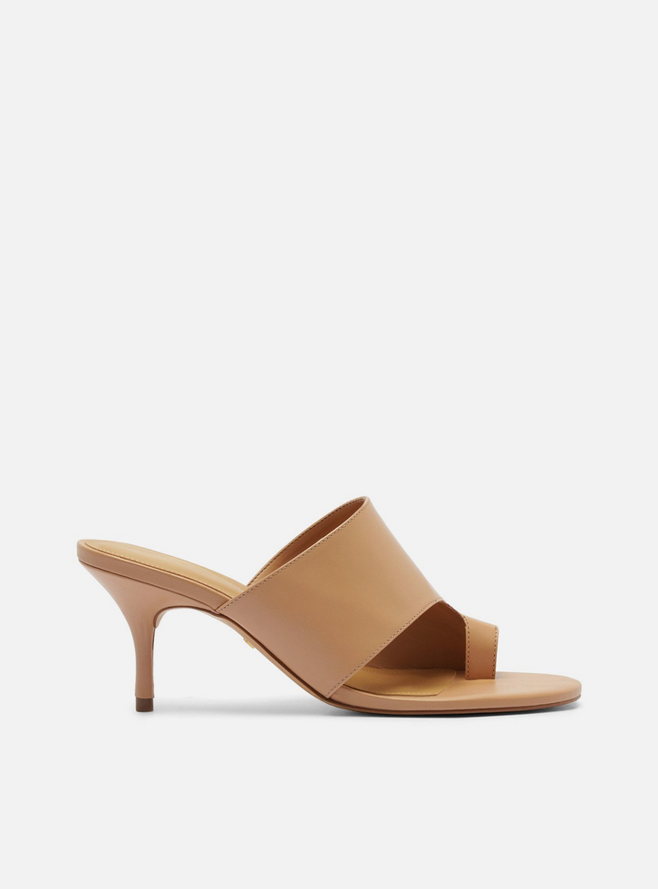 Sandália feminina bege em couro. O sapato tem salto médio fino e formato arredondado na ponta. Traz cabedal largo e liso que cobre parcialmente a parte superior do pé, deixando os dedos e o calcanhar à mostra, e com recorte que divide os dedos, estilo dedeira. Com palmilha bege e inscrição do nome da marca.