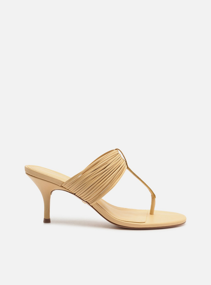 Sandália feminina bege de couro. O sapato tem salto médio fino e formato arredondado na ponta. Traz diversas tiras finas na parte superior do pé, unidas por tira fina, que também divide os dedos. Com palmilha da cor da sandália e inscrição do nome da marca.
