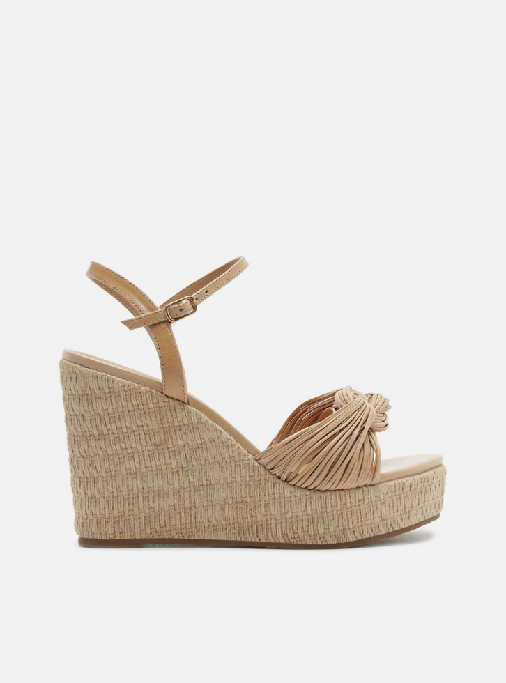Sandália feminina bege. O sapato tem salto alto plataforma, revestido em palha tramada, e formato arredondado na ponta. Traz conjunto de tiras finas torcidas sobre os dedos. Possui tira fina no calcanhar e tira no tornozelo que fecha em fivela lateral. Com palmilha bege e inscrição do nome da marca.