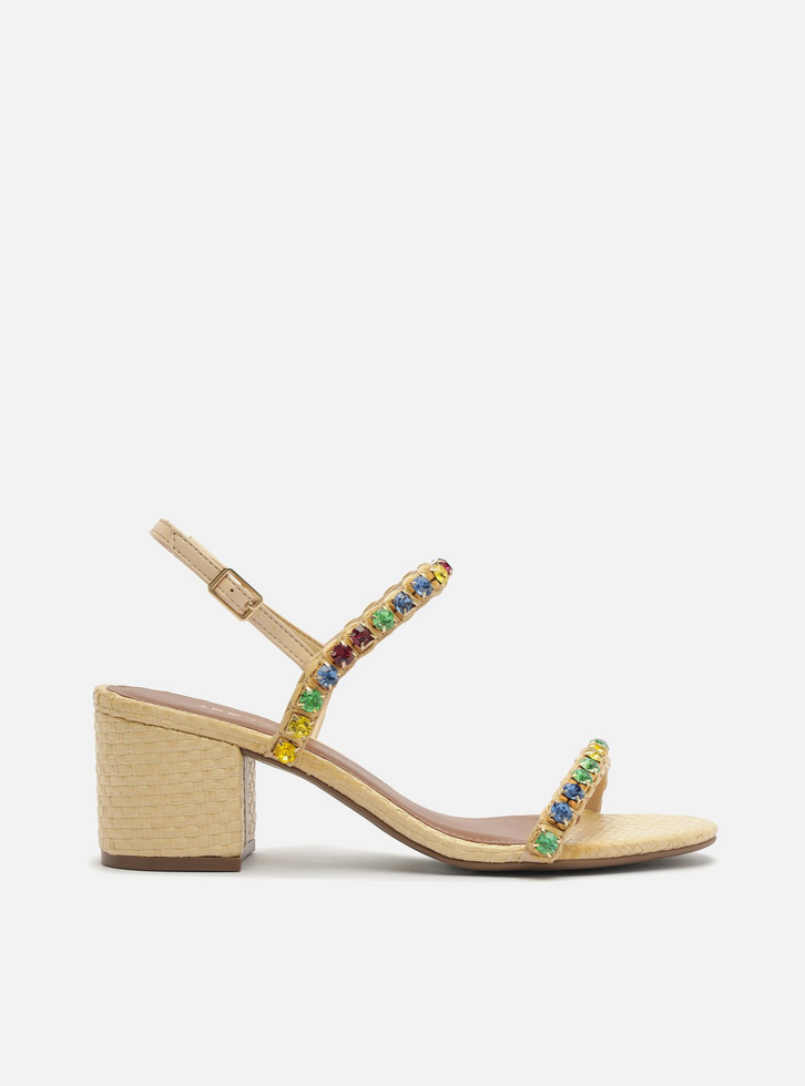 Sandália feminina bege em palha tramada. O sapato tem salto médio bloco e formato arredondado na ponta. Traz tiras finas com aplicação de pedrarias coloridas sobre os dedos e a parte superior do pé, além de tira no calcanhar com fechamento lateral em fivela metálica. Com palmilha marrom e inscrição do nome da marca.