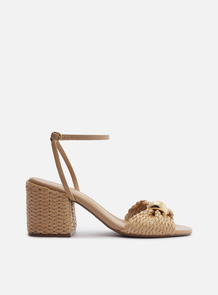 Sandália bege em palha. O sapato tem salto médio bloco, revestido em palha tramada e com contorno superior e inferior em cortiça, além de formato quadrado na ponta. Traz tira larga sobre os dedos em palha tramada e com detalhe em metal dourado, espesso e orgânico preso no centro. Possui tira fina que sai das laterais, cruza no calcanhar, contorna o tornozelo e fecha em fivela lateral. Com palmilha bege e inscrição do nome da marca.