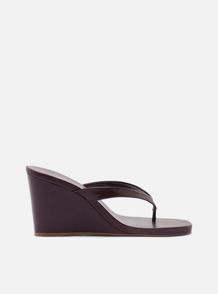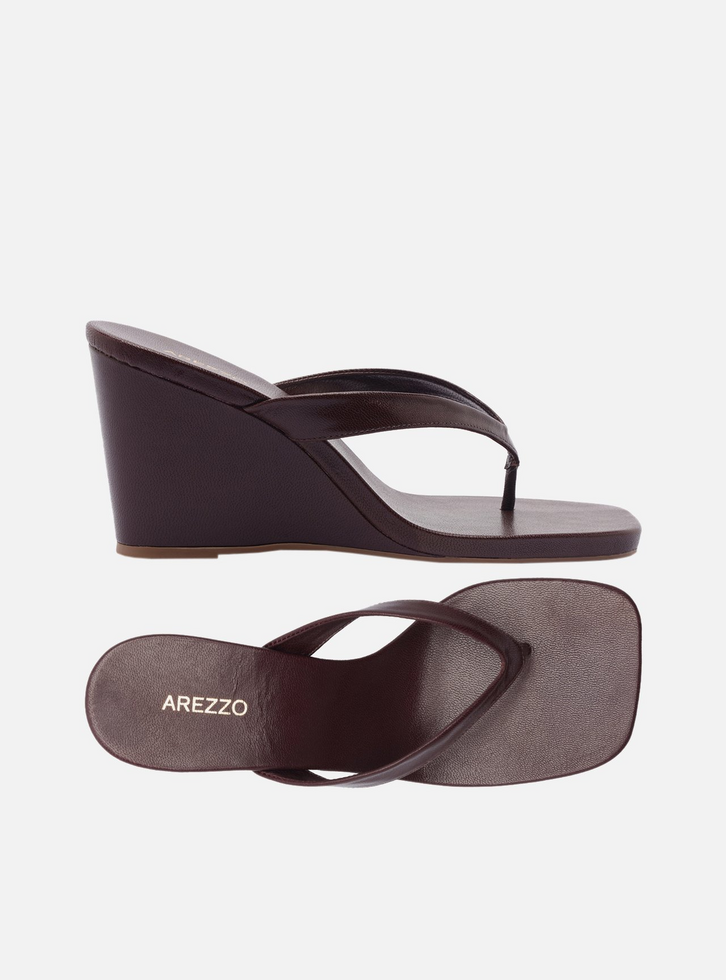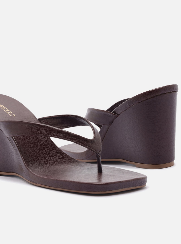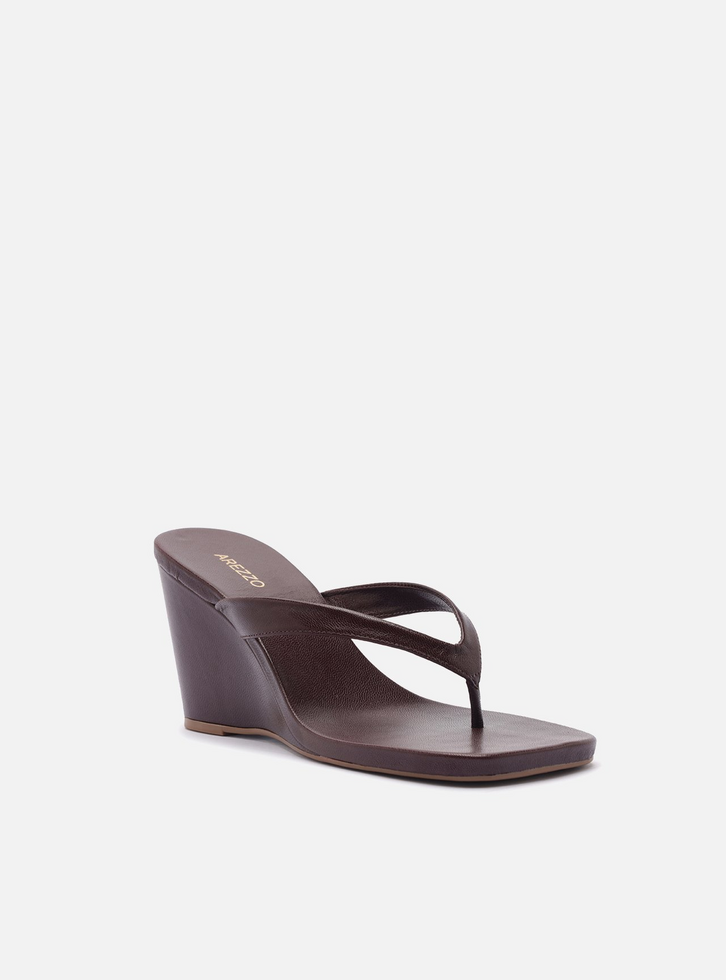 Sandália feminina bordô. O sapato tem salto alto anabela e formato quadrado na ponta. Traz tiras finas dividindo os dedos. Com palmilha da cor da sandália e inscrição do nome da marca.