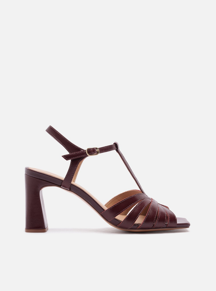 Sandália bordô em couro. O sapato tem salto médio bloco e formato quadrado na ponta. Traz tiras largas vazadas sobre os dedos e a parte superior do pé, conectadas por tira central. Possui tira fina em torno do calcanhar com fechamento em fivela lateral. Com palmilha marrom e inscrição do nome da marca.