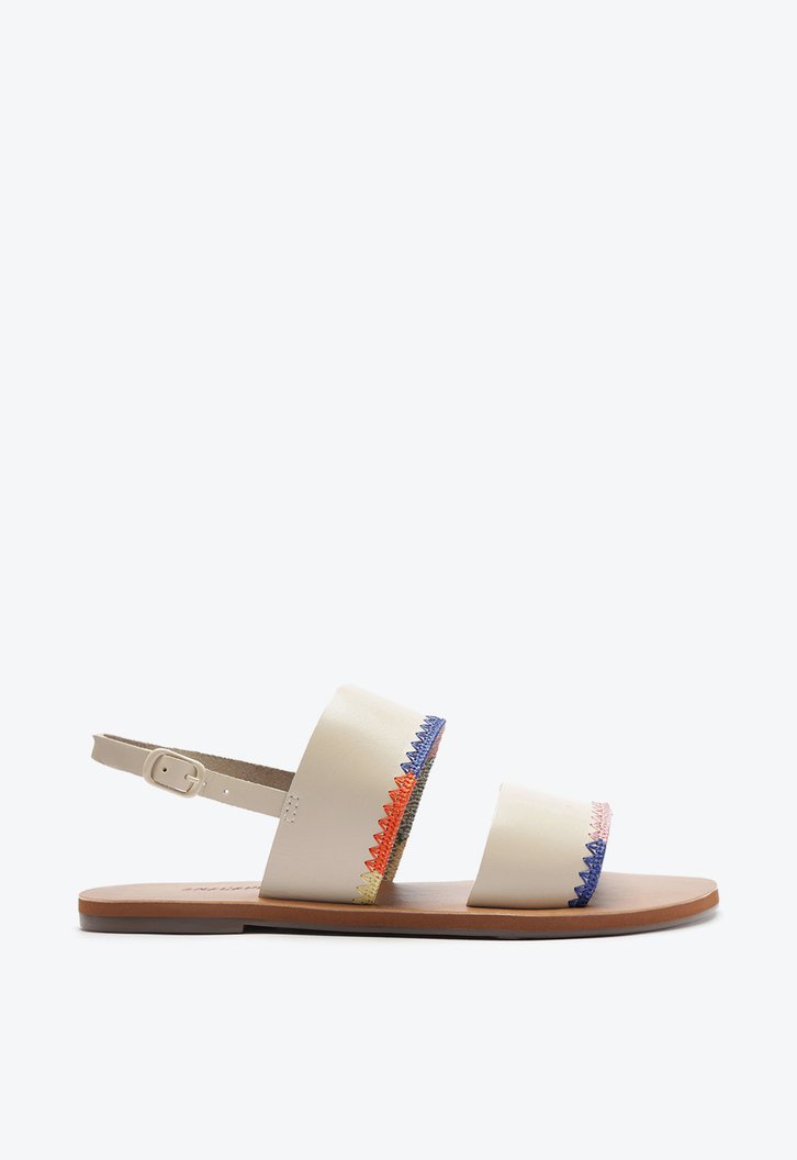 Sandália rasteira branca de couro. O modelo tem sola flat e bico redondo. Traz duas tiras largas sobre os dedos e o peito do pé em couro e com detalhe em costura colorida na borda. Possui ainda tira fina em torno do calcanhar com fecho em fivela metálica lateral. Com palmilha lisa marrom e inscrição Anacapri.