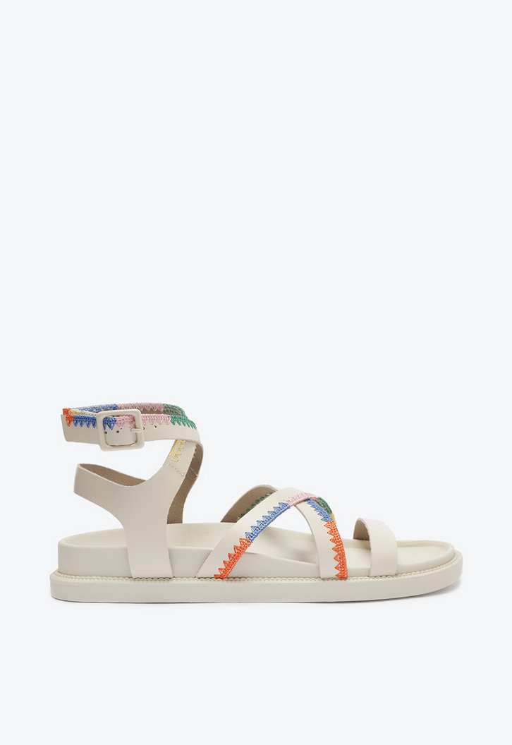 Sandália branca de couro. O modelo tem salto rasteiro, palmilha com formato anatômico e inscrição Anacapri. Possui base emborrachada e bico redondo. Traz tira lisa sobre os dedos e duas tiras cruzadas no peito do pé com detalhe em costura colorida na borda. Possui ainda tira em torno do calcanhar e tiras que se cruzam no tornozelo, também com detalhe em costuras e fecho em fivela metálica lateral.