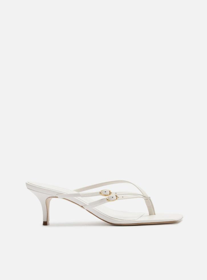 Sandália branca de couro. O sapato tem salto médio fino e formato quadrado na ponta. Traz tiras finas dividindo os dedos e com fivelas nas laterais. Com palmilha da cor do calçado e inscrição do nome da marca.