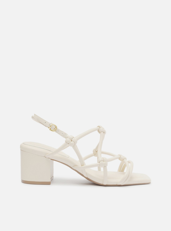 Sandália branca. O modelo tem salto médio bloco e bico quadrado. Traz tiras finas sobre os dedos, todo o peito do pé e nas laterais, unidas por nós. Com fecho em tira em torno do calcanhar e fivela metálica lateral. A sandália é aberta e exibe todo o pé.