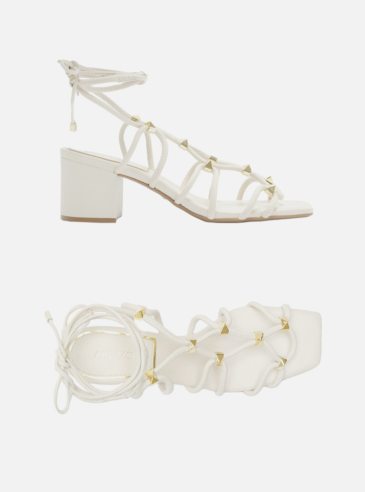 Sandália branca. Possui tiras finas com detalhes em tachas que se cruzam no peito do pé e tiras finas que prendem o tornozelo. Com salto bloco, bico quadrado e logotipo da Arezzo na palmilha.