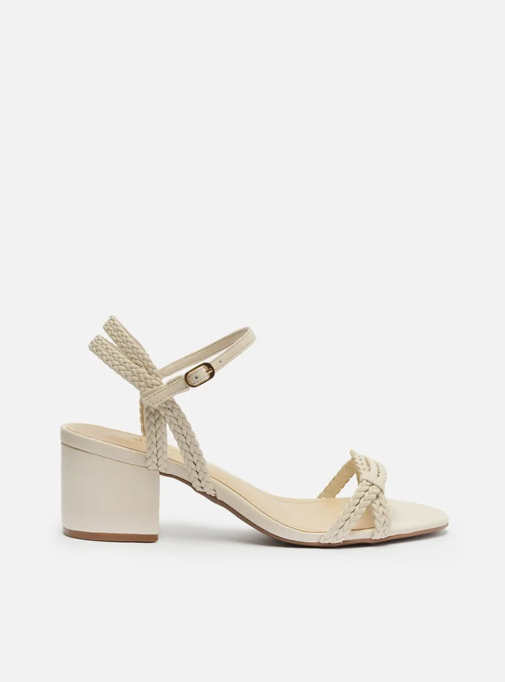 Sandália branca. O modelo tem salto médio bloco e bico redondo. Traz duas tiras trançadas sobre os dedos, unidas por elos, e mais duas no calcanhar, além de tira lisa afivelada no tornozelo. Com palmilha bege e inscrição do nome da marca. A sandália é aberta e exibe todo o pé.