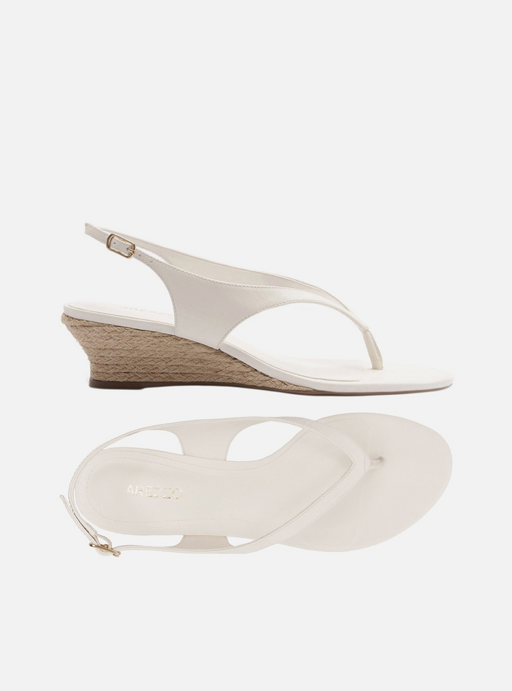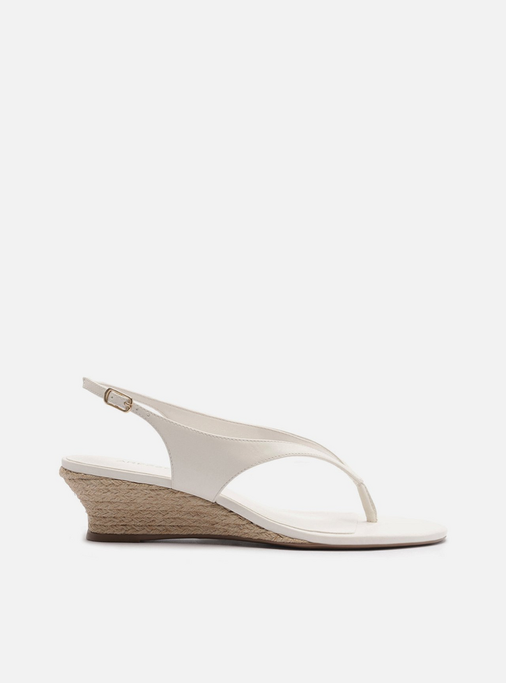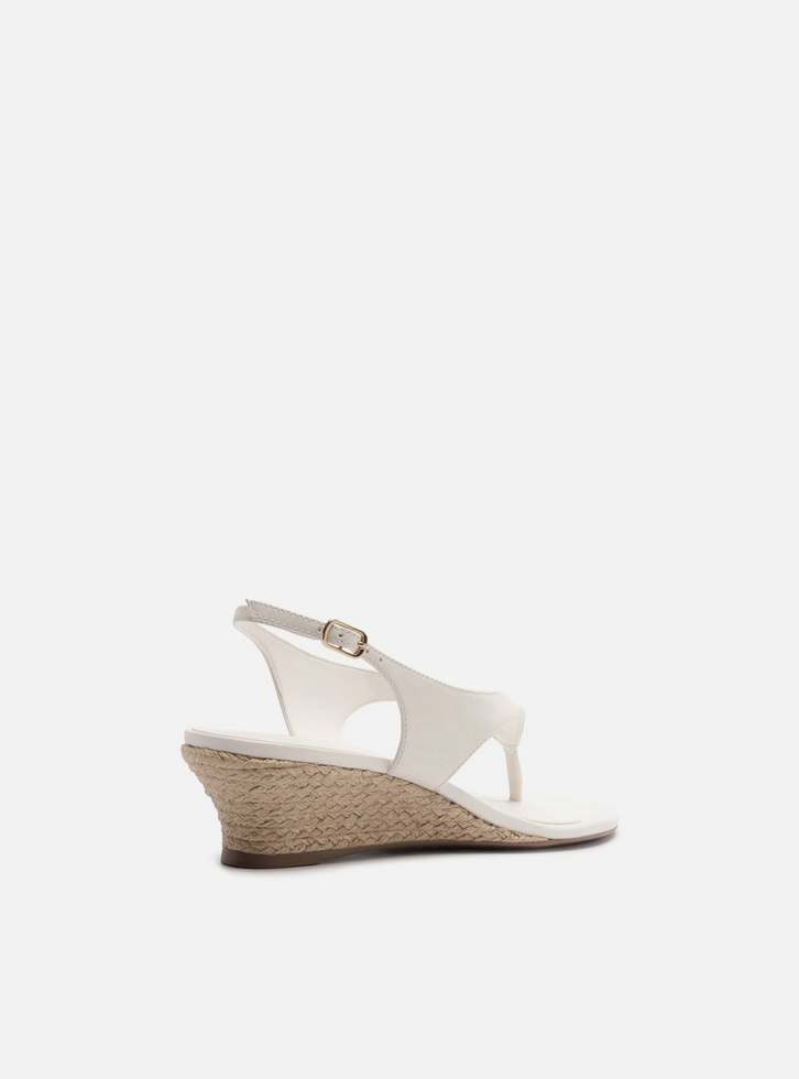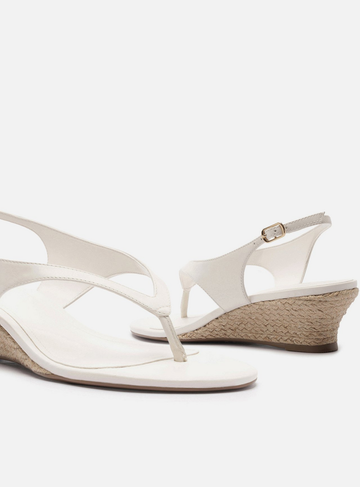 Sandália feminina branca em couro. O sapato tem salto baixo anabela curvo, revestido em corda trançada, e formato arredondado na ponta. Traz tiras que dividem os dedos, conectadas ao cabedal e ao calcanhar. Possui tira fina que contorna o calcanhar e fecha em fivela lateral. Com palmilha da cor da sandália e inscrição do nome da marca.