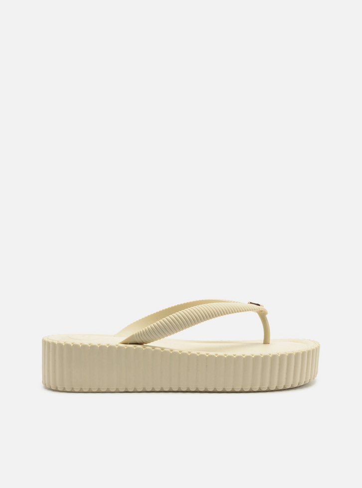 Sandália branca. O sapato tem salto baixo flatform, sola em EVA com textura canelada e formato arredondado na ponta. Traz tiras finas em PVC e texturizadas, dividindo os dedos, e com aplicação metálica no centro. Com palmilha estofada da cor do calçado e inscrição do nome da marca. A sandália exibe todo o pé.