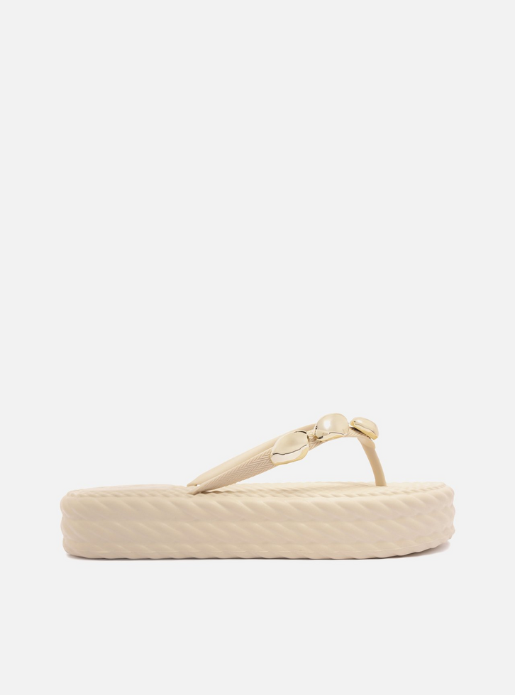 Sandália feminina branca em EVA. O sapato tem salto baixo, solado plataforma em relevo que imita tiras de cordão torcido e palmilha texturizada com nome da marca. Com formato arredondado na ponta, traz tiras finas dividindo os dedos, com aplicação de metais orgânicos dourados. Aberta, exibe todo o pé.