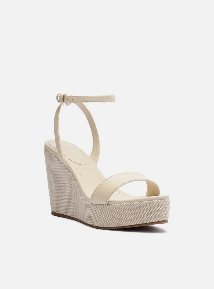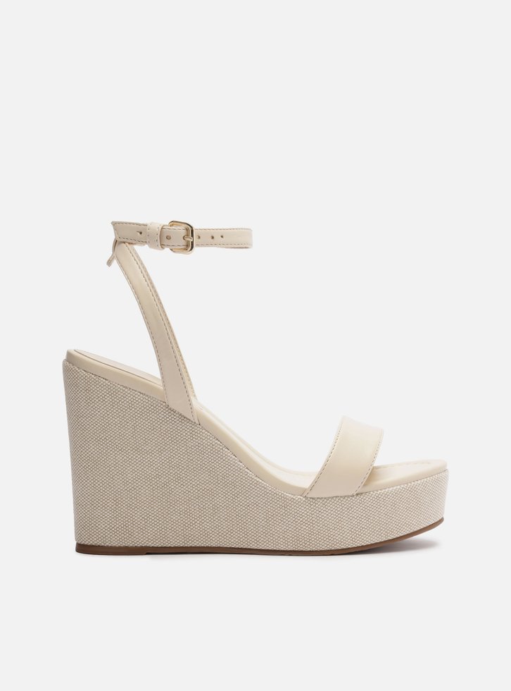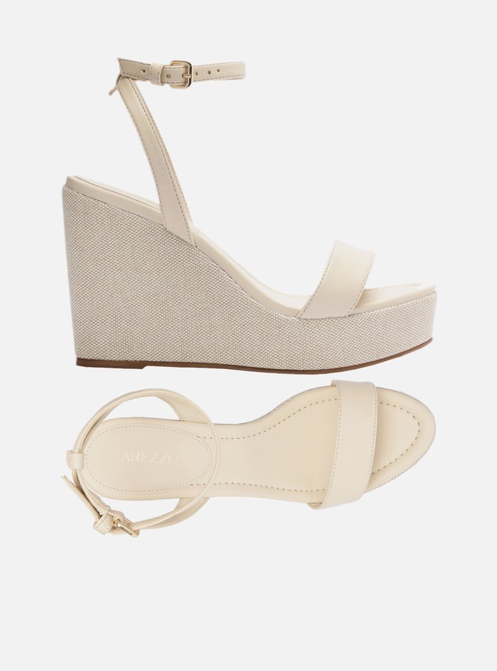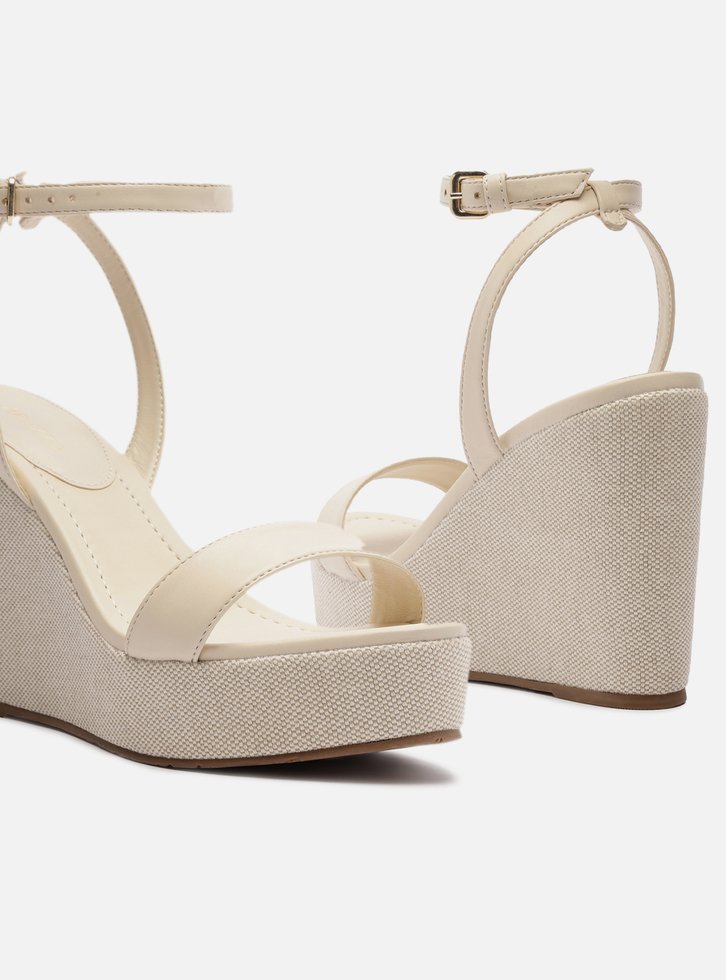 Sandália branca. O modelo tem salto alto plataforma, revestido em linho, e bico redondo. Traz tira média sobre os dedos. Aberta, possui tira fina que sai das laterais, se cruza no calcanhar, contorna o tornozelo e fecha em fivela metálica lateral. Com palmilha da cor do modelo e inscrição do nome da marca. A sandália exibe todo o pé.