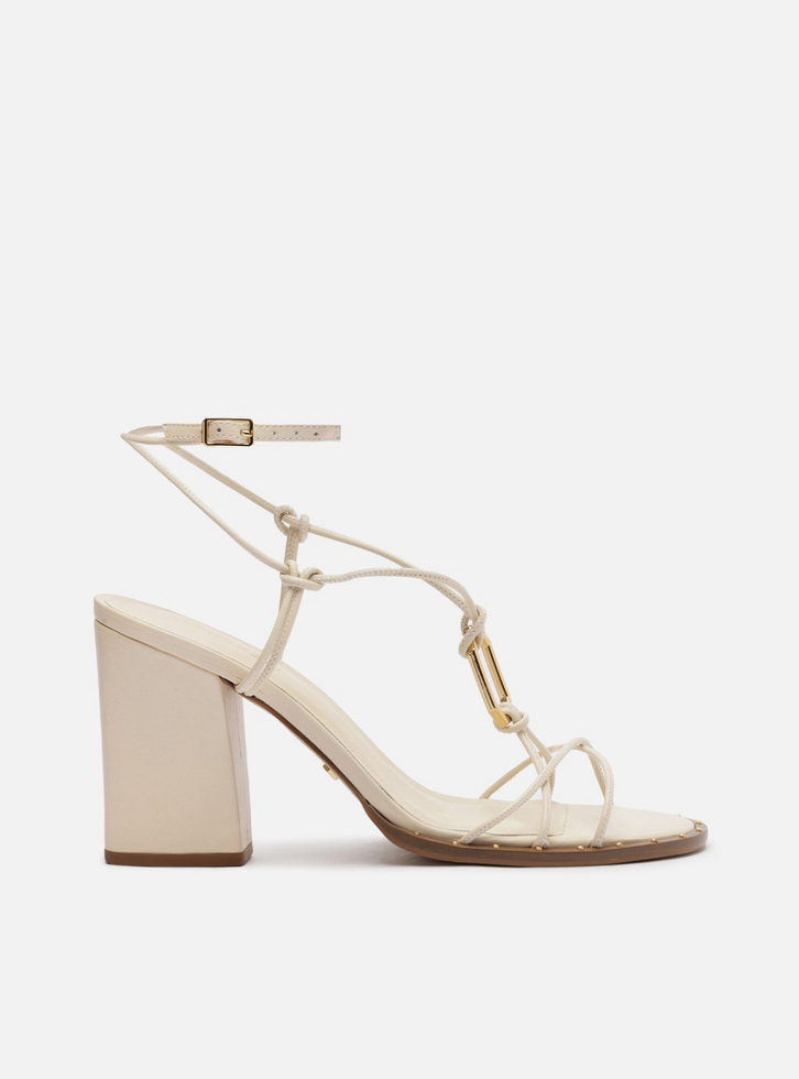 Sandália branca. O modelo tem salto médio bloco e bico arredondado. Possui tiras finas que se cruzam sobre os dedos e no peito do pé, além de aplicação central de peça metálica geométrica dourada. Conta com tira que contorna o calcanhar e fecha com fivela lateral ajustável. Com palmilha em material liso e inscrição do nome da marca.