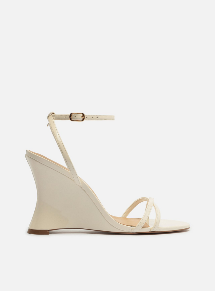 Sandália feminina branca com acabamento envernizado. O sapato tem salto alto anabela curvo e formato arredondado na ponta. Traz tiras finas cruzadas sobre os dedos. Possui tira fina que sai das laterais, contorna o tornozelo e fecha em fivela lateral. Com palmilha bege e inscrição do nome da marca. A sandália exibe todo o pé.