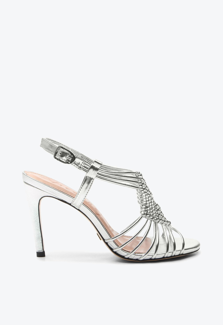 Sandália de salto alto em couro na cor prata com detalhes frontais e alça ajustável. Brilho e sofisticação em cada detalhe! Essa sandal VCZ explora os tons metalizados clássicos de forma autêntica, trazendo glamour para o visual. Possui detalhes que fazem o contraponto perfeito entre sofisticação e conforto.
