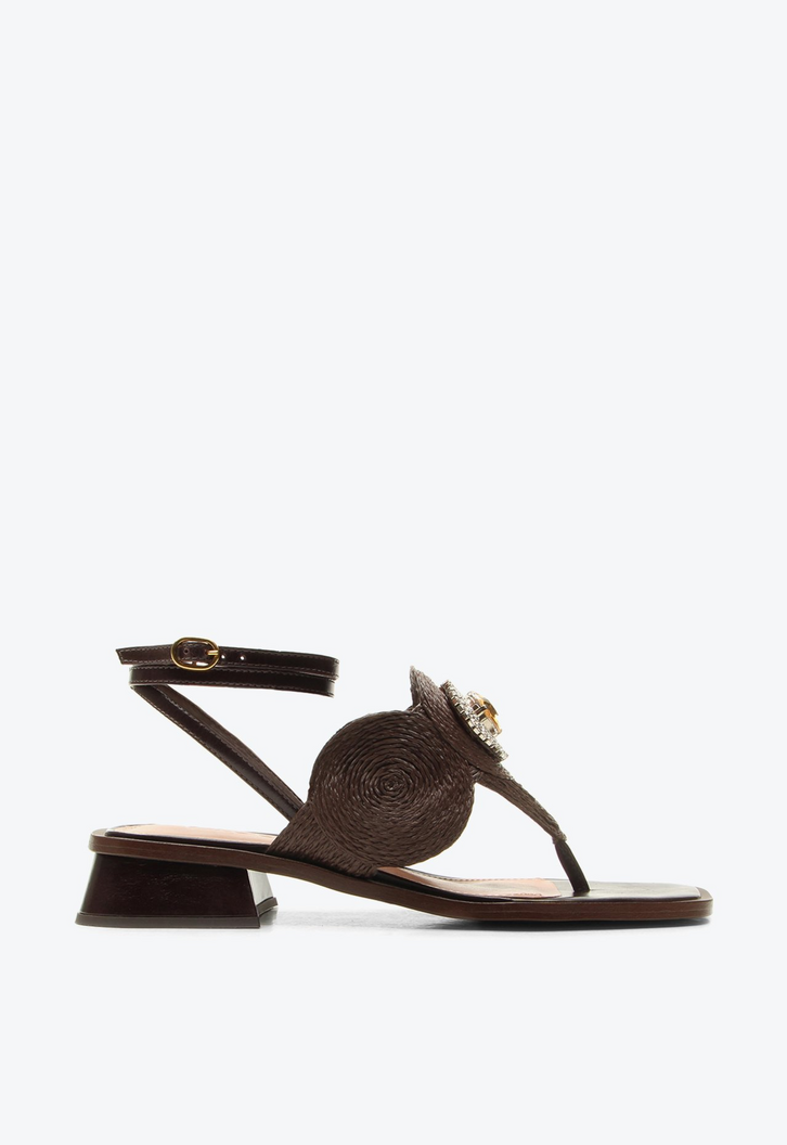 Sandália feminina Constança marrom em ráfia com acabamento em couro. Com textura natural e aplicação de studs metalizados, esse modelo traduz o estilo boho com um toque contemporâneo. O design une charme e autenticidade, enquanto o salto baixo proporciona conforto e leveza para o dia a dia. Versátil e cheia de personalidade, é a escolha ideal para compor produções estilosas e sofisticadas.
