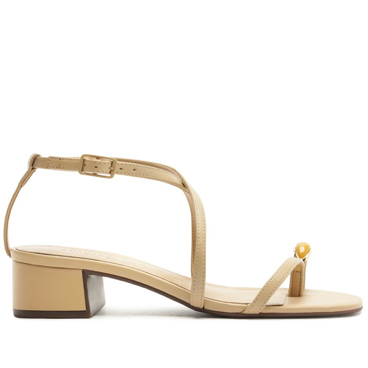 Sandália de tiras e salto bloco, com detalhe em pedraria, na cor bege. O modelo de material similar ao couro, apresenta salto em bloco médio. De biqueira quadrada, traz cabedal com tirinha em diagonal que separa os dedos, com aplicação de maxi adorno redondo em pedraria colorida, com contorno metálico sobre o dedão. Apresenta duas tiras que se cruzam sobre o peito de pé e contorna o tornozelo - com fecho afivelado lateral - conectada na tira única do calcanhar. Possui palmilha comfy no mesmo tom da sandália, contornada em pespontos, com assinatura Anacapri.