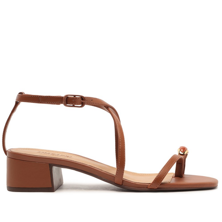 Sandália de tiras e salto bloco, com detalhe em pedraria, na cor marrom. O modelo de material similar ao couro, apresenta salto em bloco médio. De biqueira quadrada, traz cabedal com tirinha em diagonal que separa os dedos, com aplicação de maxi adorno redondo em pedraria colorida, com contorno metálico sobre o dedão. Apresenta duas tiras que se cruzam sobre o peito de pé e contorna o tornozelo - com fecho afivelado lateral - conectada na tira única do calcanhar. Possui palmilha comfy no mesmo tom da sandália, contornada em pespontos, com assinatura Anacapri.